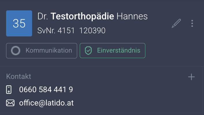 Um mit einem neuen Patienten kommunizieren zu können, muss die Arzt-Patienten-Kommunikation einmalig initialisiert werden. Dabei entsteht eine Verknüpfung zwischen Ihrer Ordination (bzw. Ihrem Arzt-Profil/Kommunikationsprofil) und dem Patienten im LATIDO-Patientenportal.