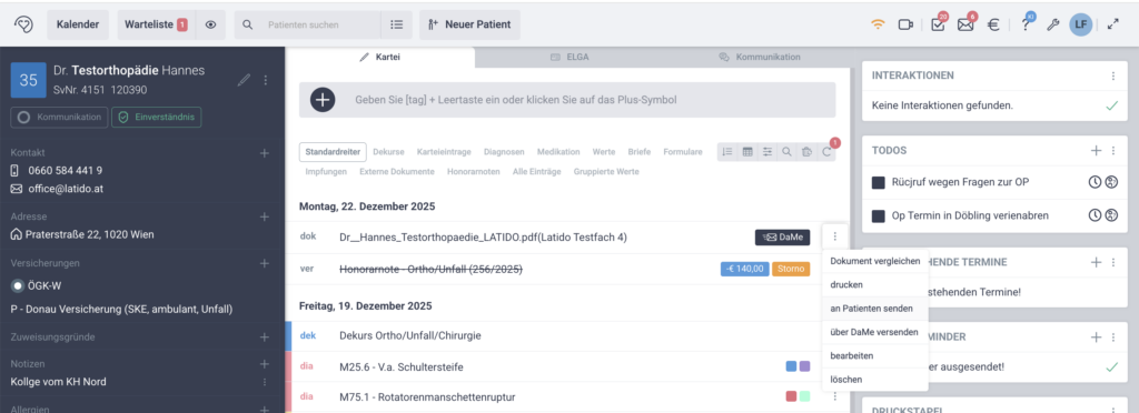 - Alternativ können Sie in der Patientenkartei beim jeweiligen Dokumente (z.B. Brief, Honorarnote) auf das Kontextmenü (3 Punkte) klicken und dort die Option “an Patienten senden” wählen.