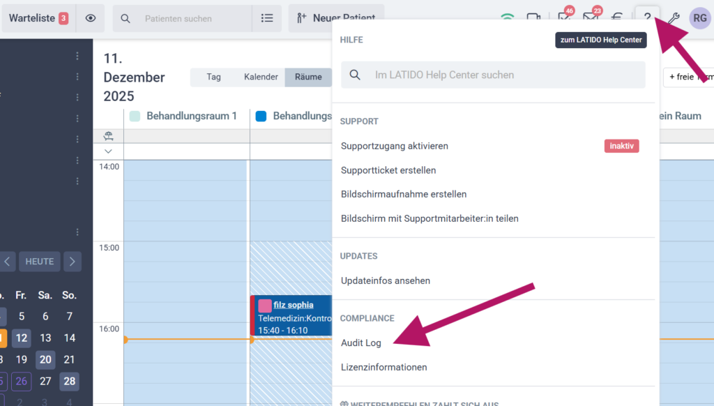 Klicken Sie auf das Fragezeichen-Symbol rechts oben und wählen Sie anschließend AuditLog aus.