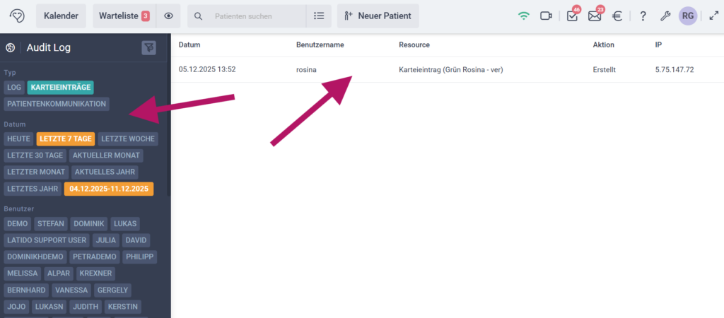 Dort können Sie nun mithilfe der Filter auf der linken Seite gezielt einsehen, welcher Benutzer welche Aktivität im System durchgeführt hat.