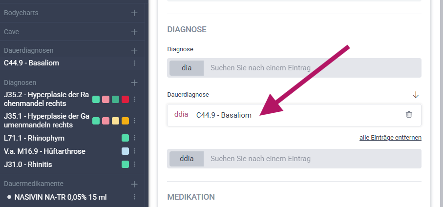 Wiederholen Sie den gleichen Schritt im Bereich „Dauerdiagnosen“ und speichern Sie den Dekurs. Ab sofort werden im Dekurs keine automatischen Diagnosevorschläge mehr angezeigt.