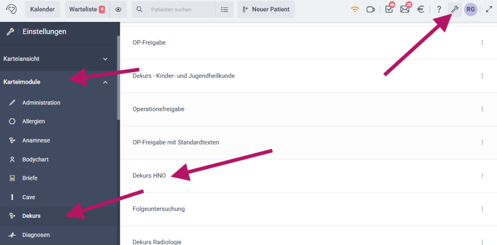Klicken Sie anschließend auf links „Karteimodule“, dann auf „Dekurs“ und wählen Sie den gewünschten Dekurs aus.