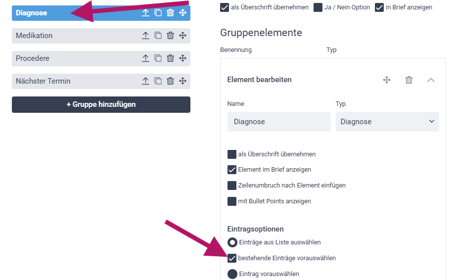 Öffnen Sie im Dekurs den Bereich „Diagnosen“. Klicken Sie auf „Diagnose“ und entfernen Sie unter „Eintragsoptionen“ das Häkchen bei „bestehende Einträge vorauswählen“. Speichern Sie Ihre Änderung.