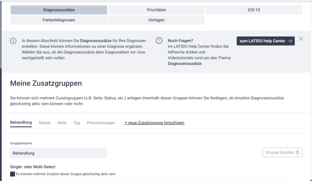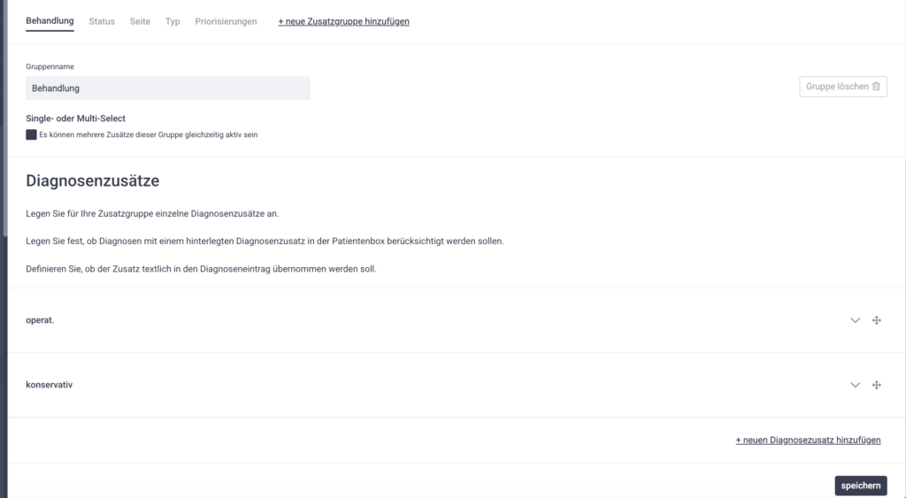 Im ersten Reiter können Sie Ihre Diagnosezusätze verwalten. Klicken Sie auf “+ neue Zusatzgruppe hinzufügen“, um eine neue Gruppe zu generieren (z.B. Diagnose Status).