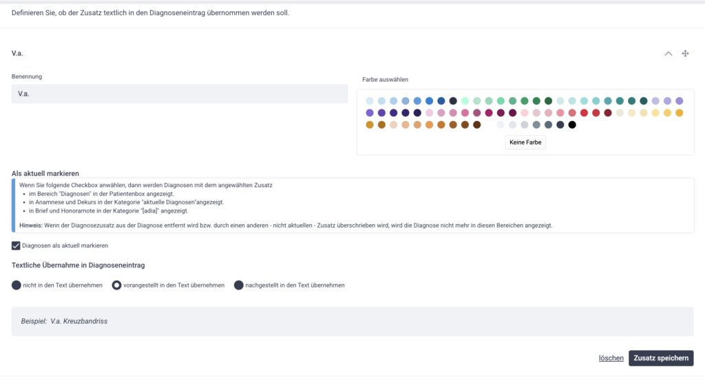 Klicken Sie innerhalb einer Zusatzgruppe auf “+ neuen Diagnosenzusatz hinzufügen“, um weitere Zusätze zu generieren. Geben Sie eine Bezeichnung ein (z.B. v.a., aktiv, st.p. st.n, etc.).
