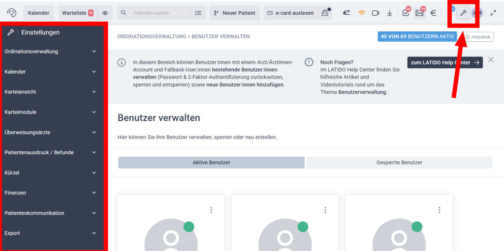 Verwalten Sie Benutzer, Ordinations- und Stammdaten, die Ansicht der Patientenkartei sowie Kalender- und Online-Terminbuchungseinstellungen.