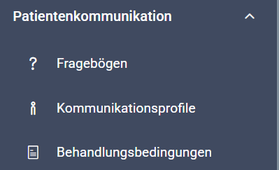 Im Bereich “Patientenkommunikation” finden Sie die Einstellungen für Fragebögen, Kommunikationsprofile und Behandlungsbedingungen.