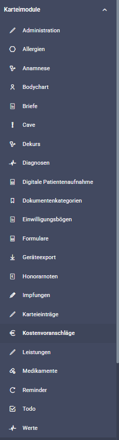 Unter Karteimodule haben Sie die Möglichkeit, eine Vielzahl von Vorlagen zu bearbeiten oder eigene individuelle Vorlagen zu erstellen, darunter: Anamnes-, Brief- ,Dekurs-, Formular- oder Honorarnotenvorlagen.