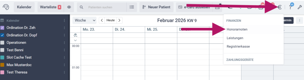 Die Finanzübersicht zeigt Ihnen patientenübergreifend alle von Ihnen erstellten Honorarnoten an. Um diese aufzurufen, klicken Sie auf Ihrer LATIDO-Startseite oben rechts auf das Euro-Symbol und wählen Honorarnoten.