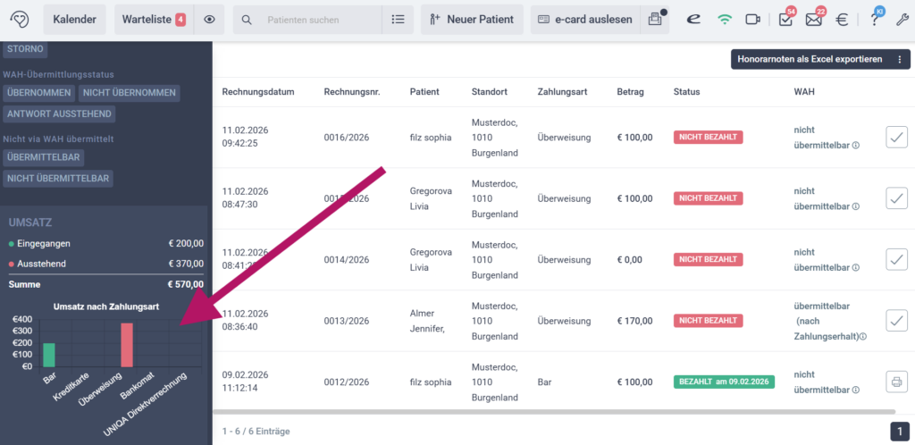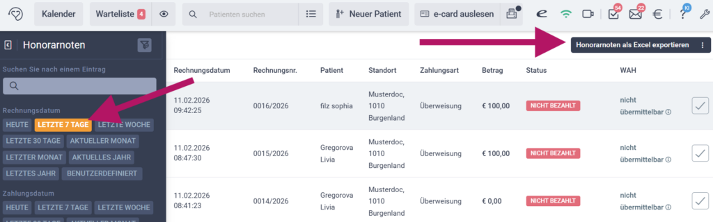 Um Ihre Honorarnoten als Excel-Liste zu exportieren, aktivieren Sie zunächst den gewünschten Filter im dunkelgrauen Bereich links. Klicken Sie anschließend oben rechts auf „Honorarnoten als Excel exportieren“.