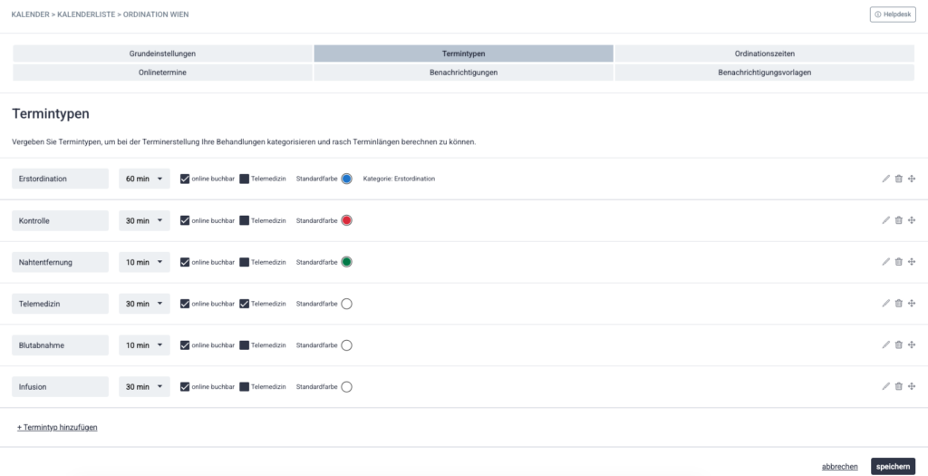 - Name des Termintyps z. B. Erstuntersuchung, Kontrolle, Beratung