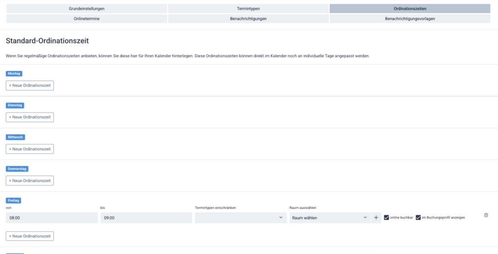In diesem Bereich definieren Sie Ihre regelmäßigen Ordinationszeiten.