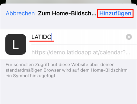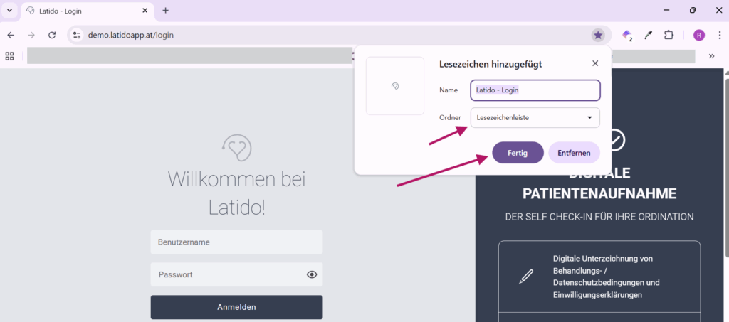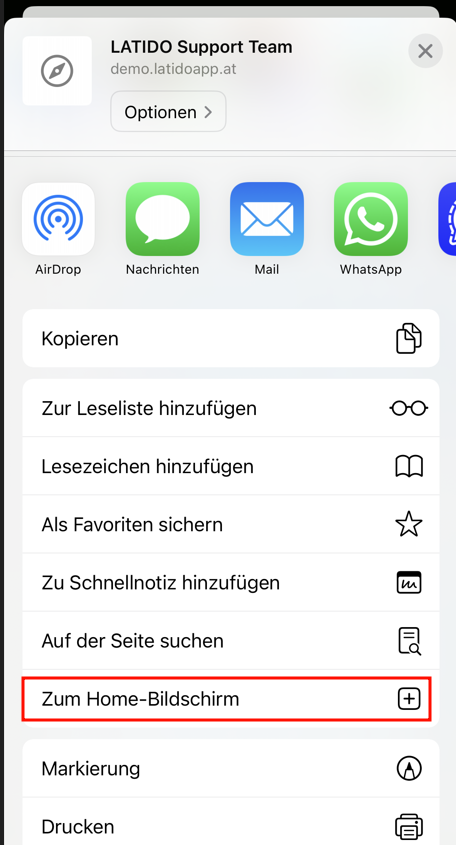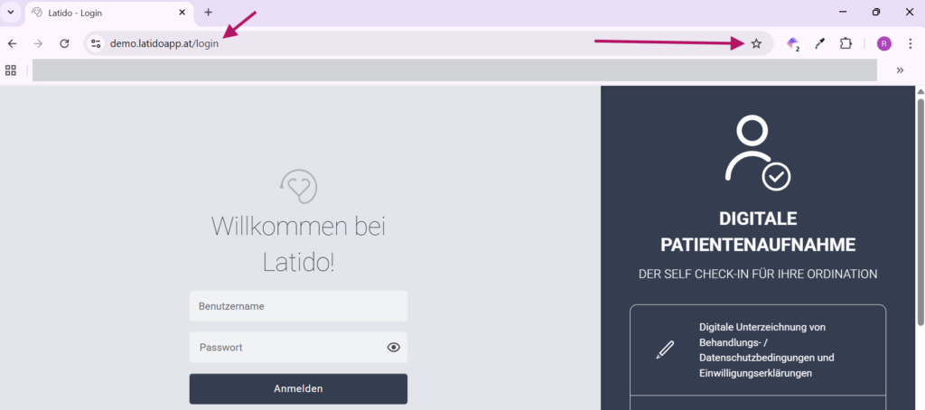 Um den LATIDO Login künftig schneller aufzurufen, können Sie ihn auf dem Smartphone zum Start- bzw. Homebildschirm hinzufügen oder am Desktop als Lesezeichen speichern. Die Vorgehensweise variiert je nach verwendetem Betriebssystem und Browser.
