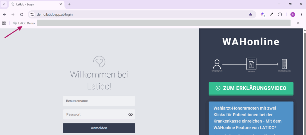 1: Öffnen Sie im Google Chrome Browser Ihre LATIDO Webseite (xxx.latidoapp.at).
