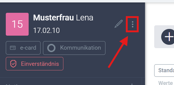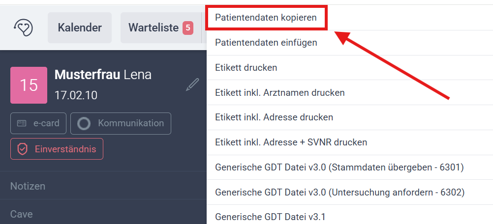 Klicken Sie in der Kartei, deren Stammdaten Sie kopieren möchten, auf die drei Punkte und anschließend auf „Patientendaten kopieren“.
