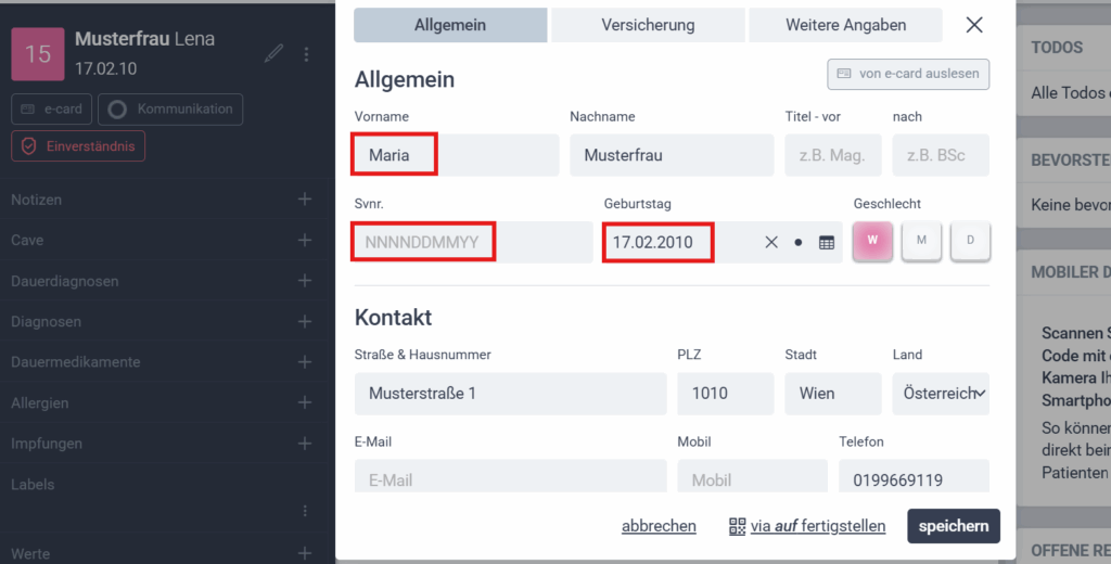 Sie befinden sich nun automatisch in der kopierten Kartei. Klicken Sie auf den Namen des Patienten bzw. der Patientin, um die Stammdaten anzupassen (z. B. Vornamen, SVNR, Geburtsdatum ändern). Klicken Sie anschließend auf speichern.
