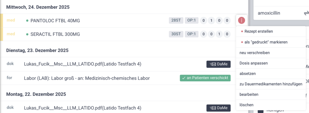 ➡️ Wichtig: Rechts neben dem Medikament sehen Sie einen roten 3-Punkte-Button. Dieser signalisiert, dass dieses Medikament noch nicht gedruckt wurde und für ein Rezept verfügbar ist.