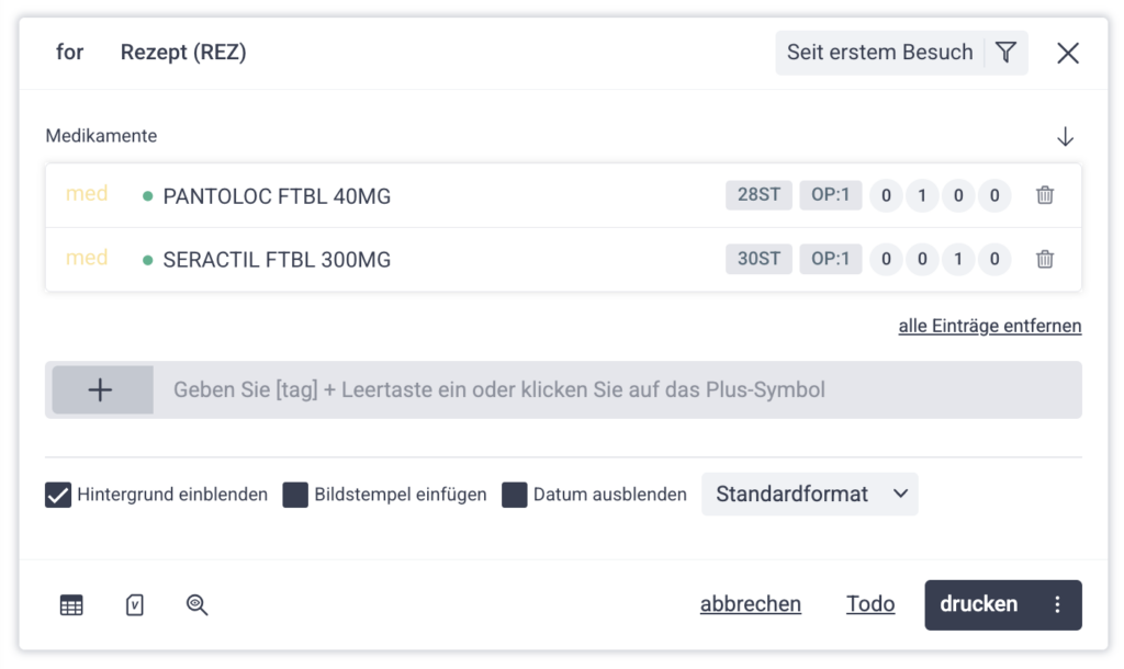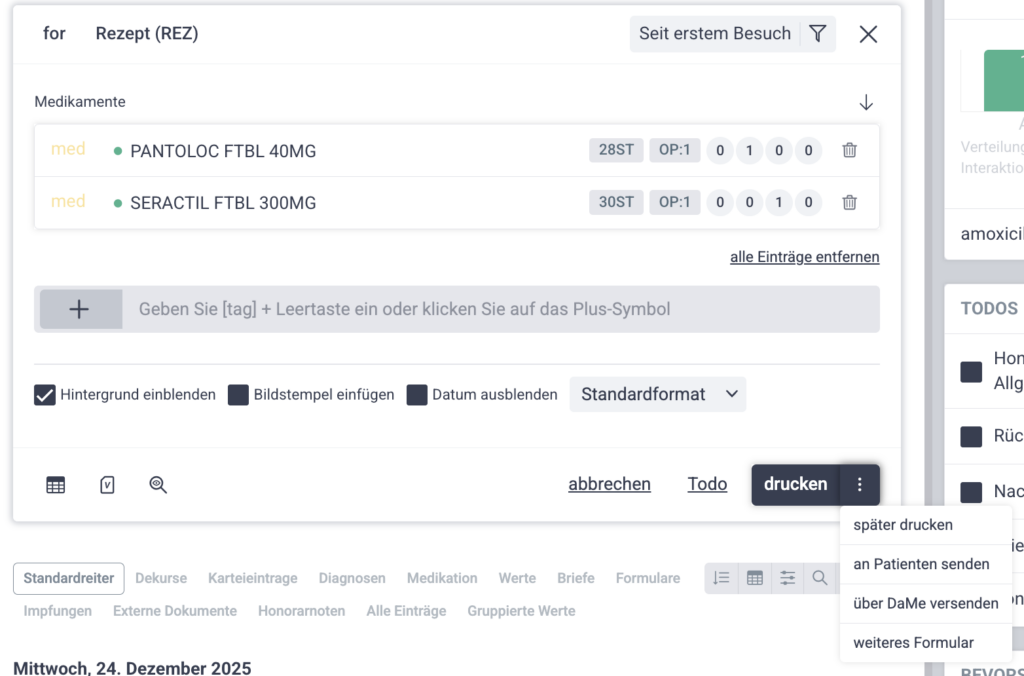 Sobald Sie ein Medikament in LATIDO erfassen, erscheint es automatisch in der Patientenkartei. Sie können Medikamente wie folgt in die Kartei eintragen: