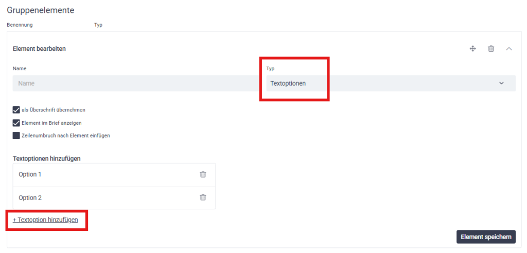 Sie bieten mehr Flexibilität als Standardtexte, da innerhalb eines Elements zwischen mehreren Vorlagen gewählt werden kann. Im Gegensatz zu Wortkürzeln sind Textoptionen jedoch an ein bestimmtes Element gebunden.
