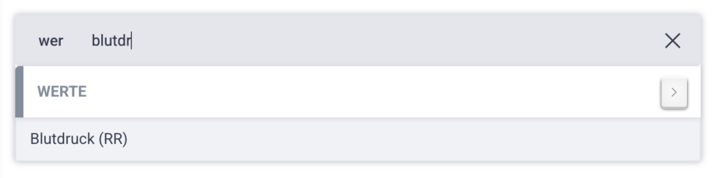 1. Klicken Sie in der jeweiligen Patientenkartei auf das “+ Symbol” in der Kommandozeile und wählen Sie “Werte” ODER geben Sie das Kürzel “wer” + Leerzeichen in die Kommandozeile ein. Suchen Sie nach dem gewünschten Wert.