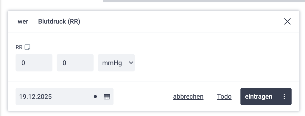2. Klicken Sie auf den entsprechenden Wert. Je nach Wert öffnen sich ein oder mehrere Eingabefelder. Tragen Sie nun den Wert ein. Bei Bedarf können Sie die Einheit des Wertes noch definieren. Darüber hinaus können Sie über das Kalender-Symbol links unten, wie bei allen Einträgen in LATIDO das Erstellungsdatum verändern.