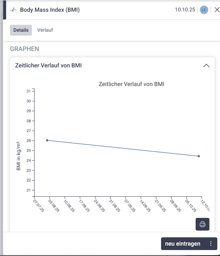 TIPP: Wenn Sie auf einen Wert in der Patientenbox links klicken, dann öffnet sich rechts eine zeitliche Verlaufskurve dieses Wertes, sobald sie ihn an mindestens zwei unterschiedlichen Tagen eingetragen haben. Sie können diese Verlaufsgrafik auch mit einem Klick auf das Drucker-Symbol unter der Grafik ausdrucken.