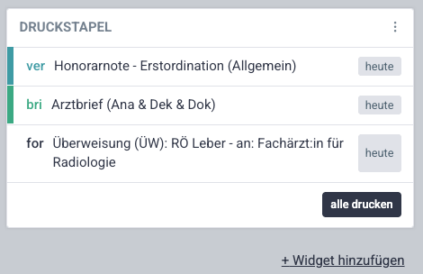 DRUCKSTAPEL – Hier sammeln sich Briefe, Formulare & Honorarnoten, die Sie über das Kontext-Menü mit “später drucken” markiert haben. Über den Button “alle drucken” können alle Dokumente gesammelt gedruckt werden.