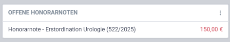 OFFENE HONORARNOTEN – Hier werden offene Honorarnoten angezeigt. Mit Klick auf die Honorarnote im Widget, öffnet sich die Vorschau und über das Kontext-Menü (drei kleine Punkte) kann sie als “bezahlt” markiert werden. Sobald das erledigt ist, verschwindet der Eintrag aus dem Widget.