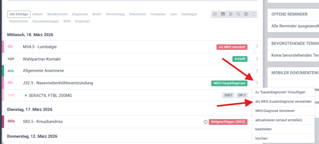 - „als WKS-Zusatzdiagnose eintragen“ → meldet die Diagnose als Zusatzdiagnose an WKS