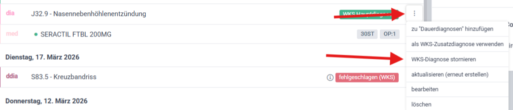 - Die Diagnose wird in WKS storniert und erhält die Statusanzeige „via WKS storniert“.