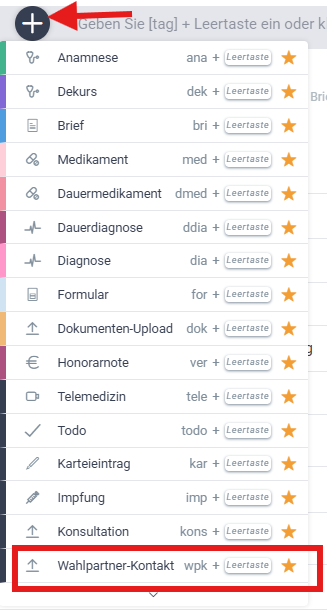 Sie können entweder auf das „Plus“-Symbol in der Kommandozeile > Wahlpartner-Kontakt klicken oder noch einfacher „wpk + [LEERTASTE]“ in der Kommandozeile eingeben, um einen neuen Wahlpartner-Kontakt zu erstellen.