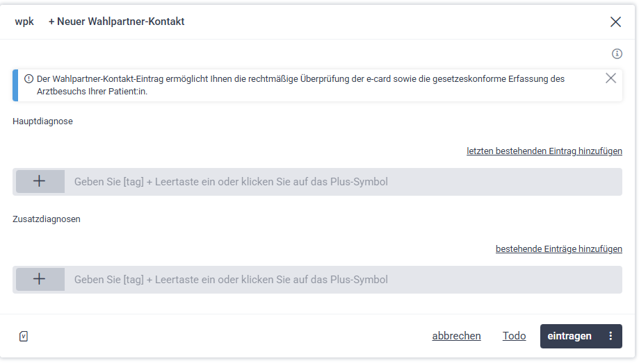 Wenn Sie nachträglich feststellen, dass eine Diagnose bei einem bereits bestehenden WPK-Kontakt fehlt, können Sie diese auch im Nachhinein ergänzen und an den entsprechenden (älteren) WPK-Kontakt übermitteln.