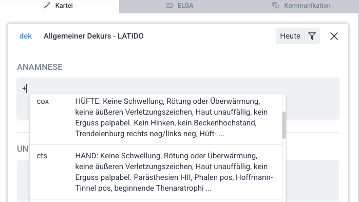 Wortkürzel sind praktische Textbausteine, die mit dem “+” auf der Tastatur in beliebige Textfelder hineingeladen werden – zum Beispiel beim Schreiben von Dekursen oder beim Erstellen von Formularen. Sie erleichtern den Arbeitsalltag durch enorme Zeitersparnis. Viele Ärzte und Ärztinnen nutzen Wortkürzel z.B. für “Standard-Procedere” oder “Ohne-Befund-Textbausteine”.